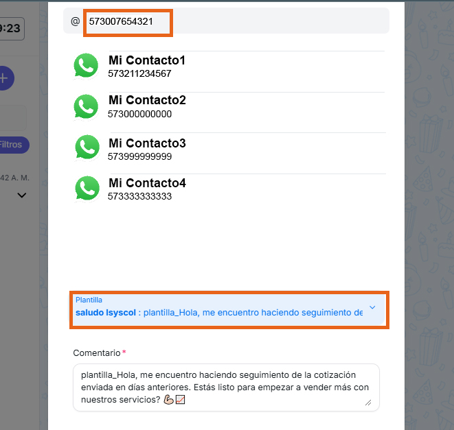 3. Elija el contacto y la plantilla para iniciar conversación. Si el contacto no está en su agenda, escriba el número con indicativo (Ej; Para Colombia 573XXXXXXXXX) en el buscador: