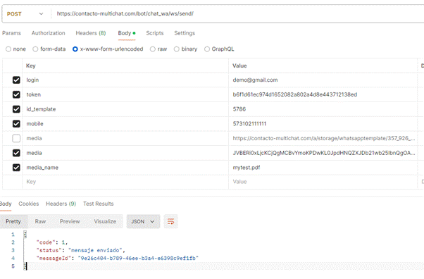 Endpoint: https://contacto-multichat.com/bot/chat_wa/ws/send/